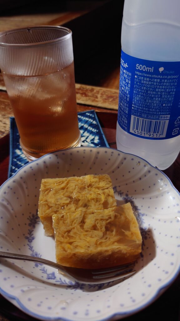 ここのお母さん、毎回コーヒーやお菓子をくれるんです。 金沢の文化とは言え、ほんとに頭が下がります。 今日は写真の「えびすさん」をいただきました。 寒天と卵、味付けはしょうゆ味。北陸の伝統的な料理で、夏の食欲がない時期に作られます。