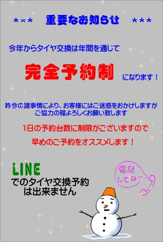 タイヤ交換について重要なお知らせとお願い🙇。完全予約制となります。