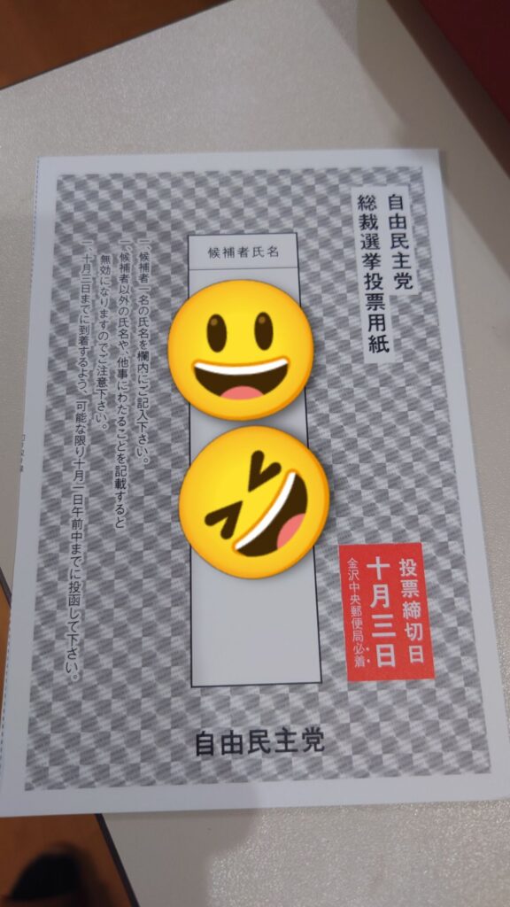 私も一応自民党員なんで、我が家にも投票用紙が来ました。