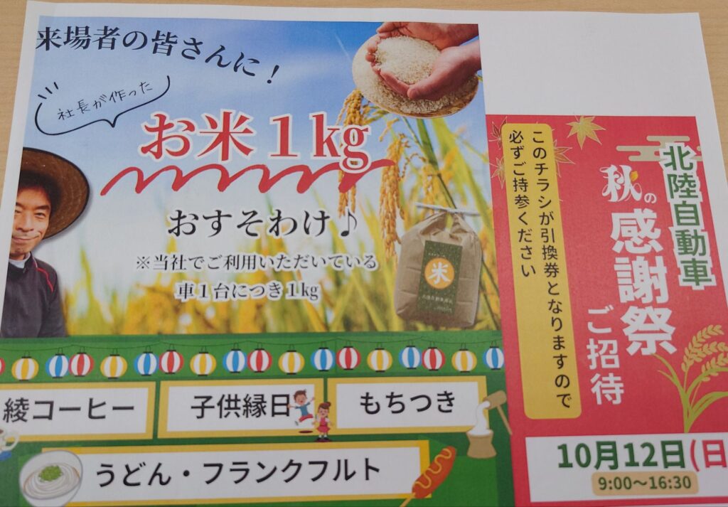 農家の私が作ってる「ゆめみづほ」を、車検や購入いただいてる一台につき1キロのお米をお分けします。