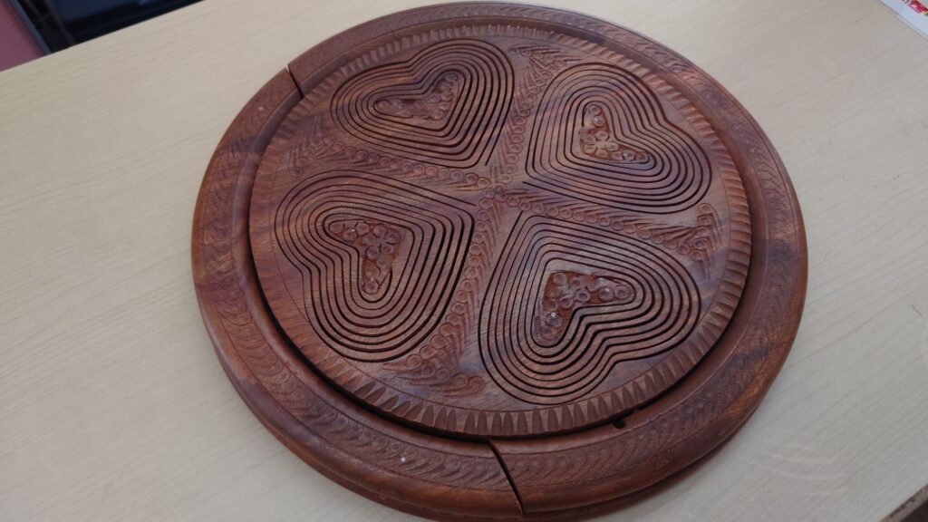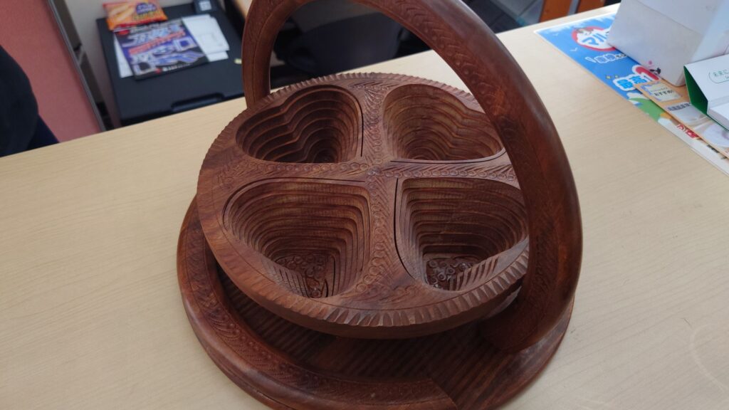 なんか民芸品らしいが、なかなかすごい! 取っ手を持ち上げるとハート型の物入れ?お菓子運ぶもの?らしいものにトランスフォームする(笑)